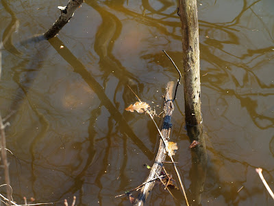 Sort of. The turtle caught me off guard by being on the different side of a small peninsula and once again it managed to disappear before I could photograph it further. While still blurry (as auto-focus doesn't work well on submerged objects) there's no doubt the object in question is a snapping turtle. I wasn't sure if I saw subtle keels in the photo, so that coupled with the outrageous size made me wonder about species identification. Common Snapping Turtles (Chelydra serpentina) are native to my region, have keels that effectively disappear with age, and have a maximum SCL (strait carapace length) of 49.4 cm (1'7") (Ernst and Lovich 2009). Since the turtle I observed appeared to be around (or exceeding) the record size, I wondered if the prospect of running into an accidentally introduced species would be more likely. Alligator Snapping Turtles (Macrochelys temminckii) can reach an SCL of 80 cm (2'7" - typically 40-50 cm or 1'3" to 1'7"), but have prominent keels on the carapace, and only occupies river systems flowing into the Gulf of Mexico (Ernst and Lovich 2009). I noticed that some specimens have keels that are surprisingly subtle, so I can't discount them based on that trait.